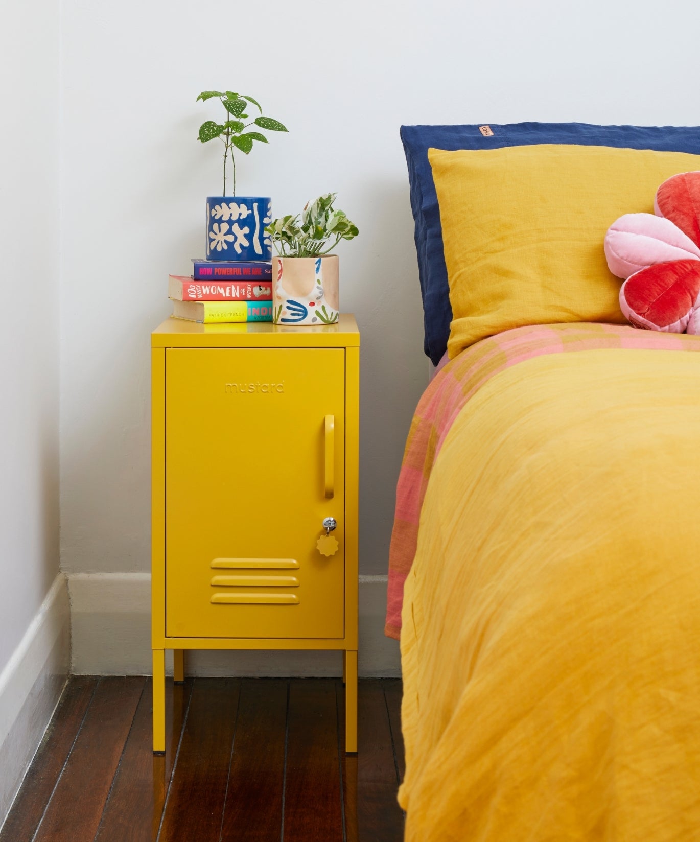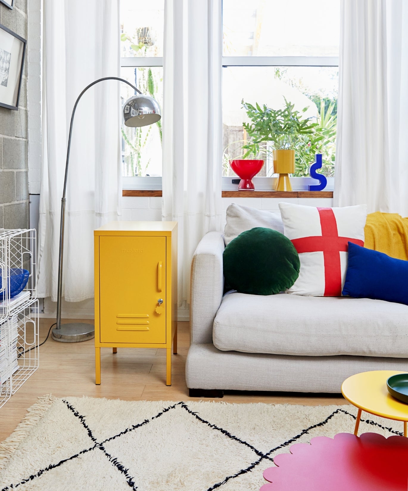 Inside, there are two adjustable shelves and one handy hook. On the outside, you'll find a handle, lock, custom keyring, air vents and a subtle embossed 'mustard', to let you know it's the real deal. The door opens to the left! Plus, the whole locker is smooth, matte and magnetic. Screens don't always do our colours justice — order a swatch to see how it looks in your space.