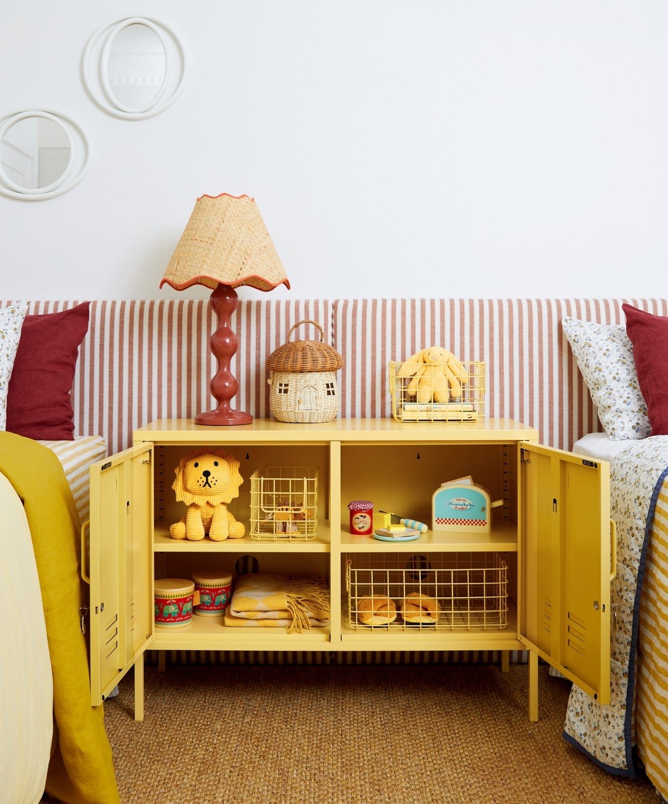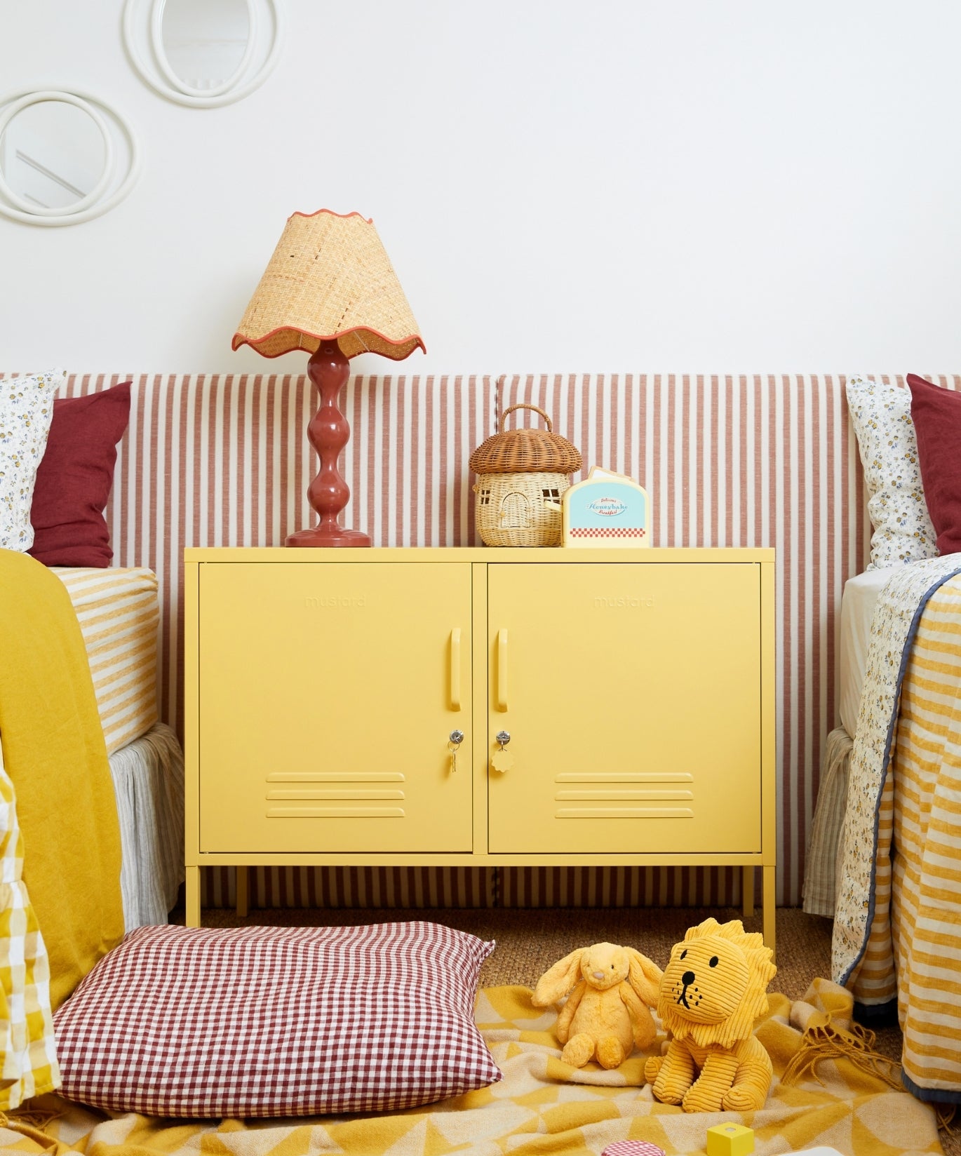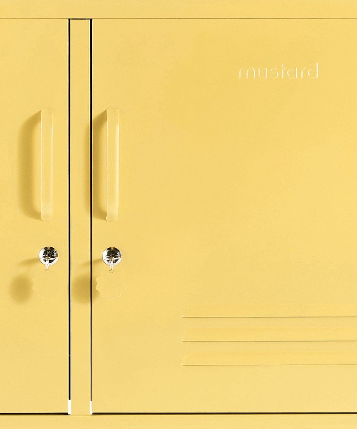 Inside, you'll find two adjustable shelves and a handy hook inside each door. On the outside, you'll find handles, locks, custom key rings, air vents, two cable holes, wall attachment points and a subtle embossed 'mustard' on each door, to let you know it's the real deal. Plus, the whole locker is smooth, matte and magnetic! Screens don't always do our colours justice — order a swatch to see how it looks in your space.