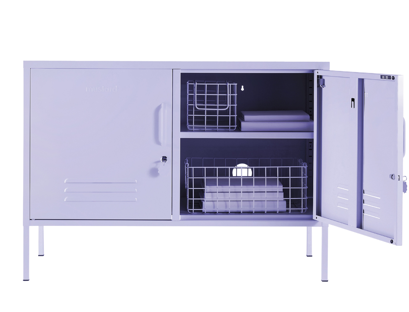 Inside, you'll find two adjustable shelves and a handy hook inside each door. On the outside, you'll find handles, locks, custom key rings, air vents, two cable holes, wall attachment points and a subtle embossed 'mustard' on each door, to let you know it's the real deal. Plus, the whole locker is smooth, matte and magnetic! Screens don't always do our colours justice — order a swatch to see how it looks in your space.