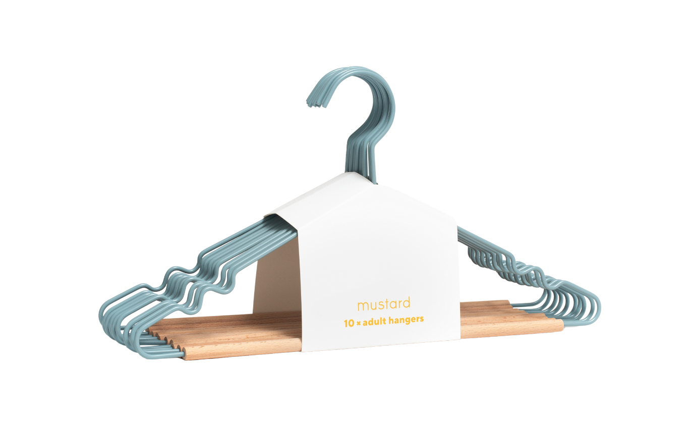 Give your clothes the VIP treatment! Our colourful metal Hangers have a smooth finish, wooden detail and signature Mustard squiggle.