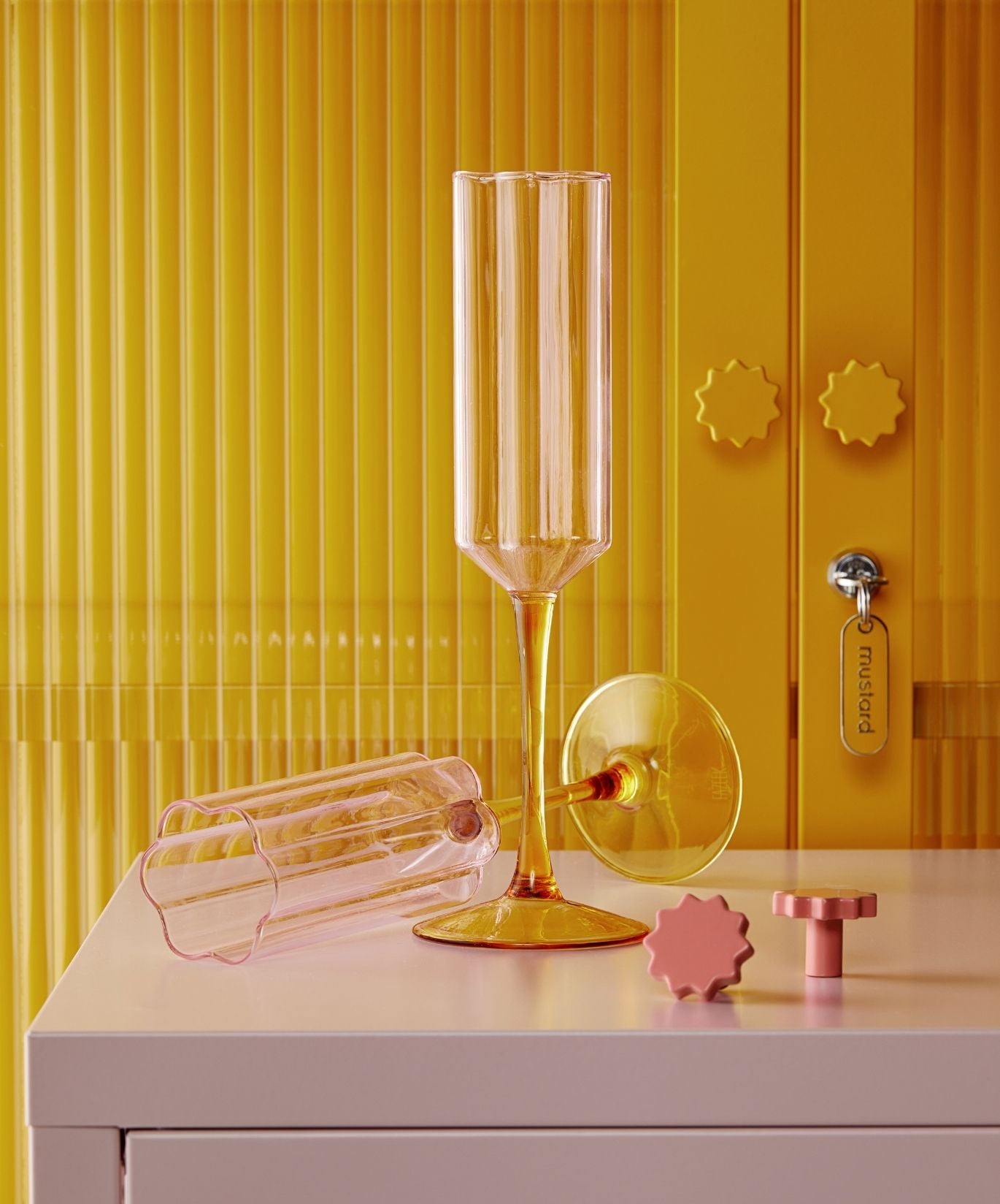 I love these flutes! the colour contrast, the Mustard logo at the edges. I get a sense of being a non-conformist; breaking away from the traditional crystal that I’ve enjoyed before.