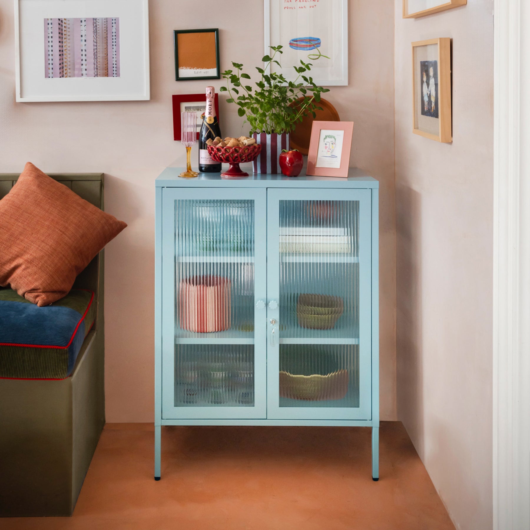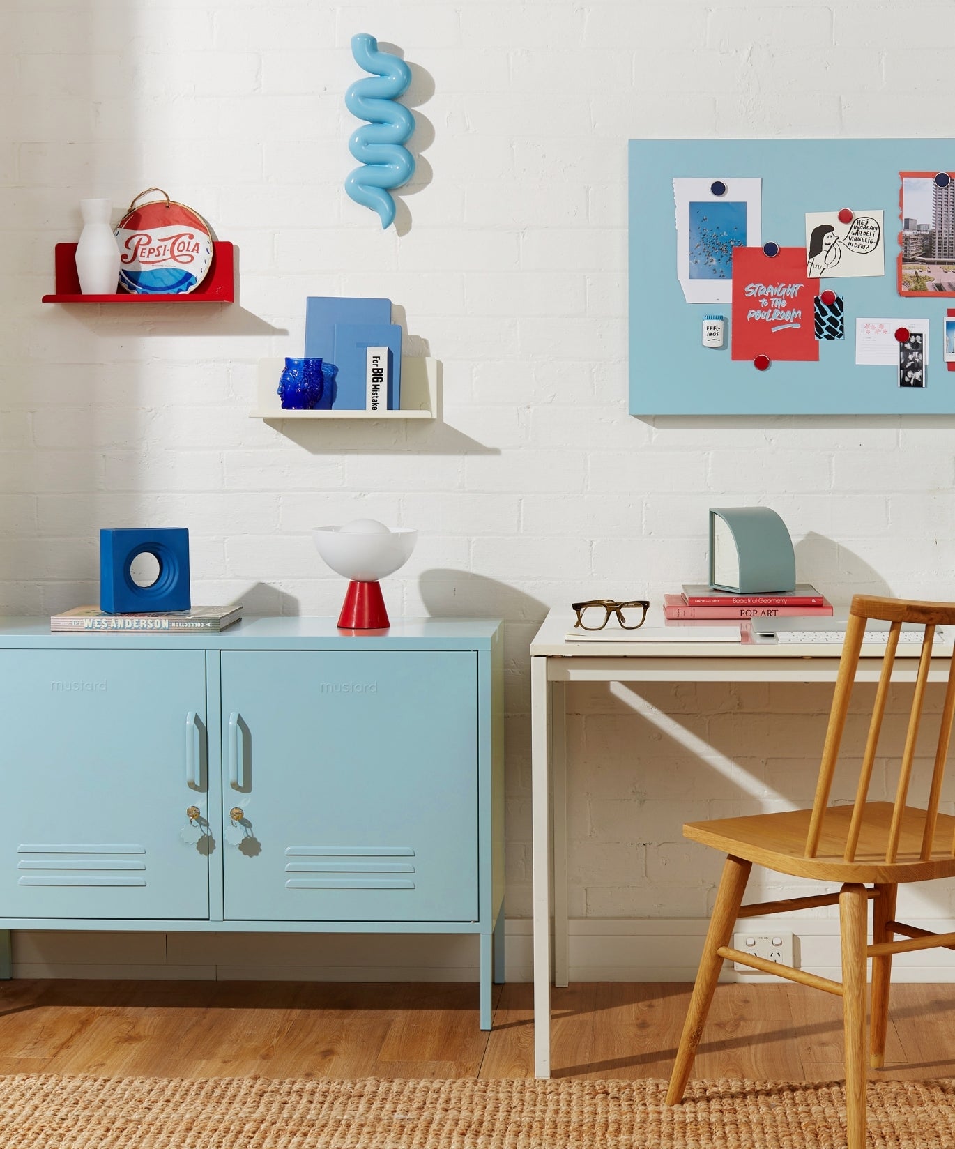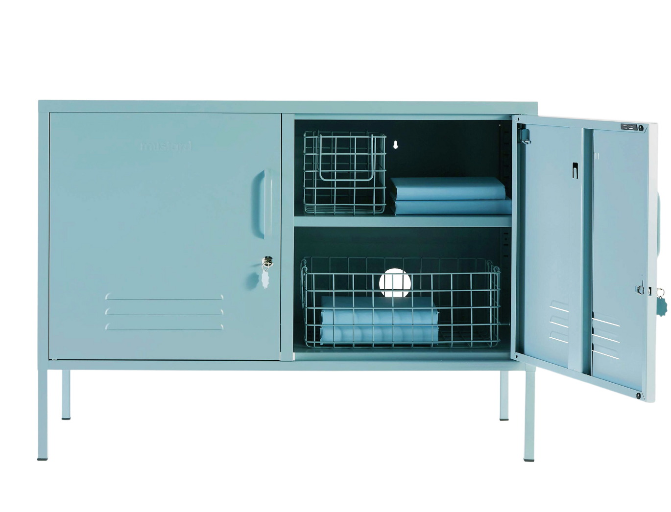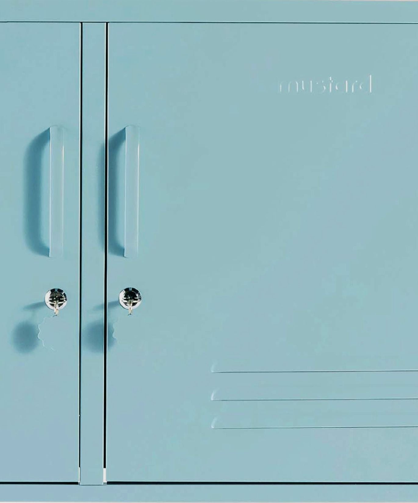 Inside, you'll find two adjustable shelves and a handy hook inside each door. On the outside, you'll find handles, locks, custom key rings, air vents, two cable holes, wall attachment points and a subtle embossed 'mustard' on each door, to let you know it's the real deal. Plus, the whole locker is smooth, matte and magnetic! Screens don't always do our colours justice — order a swatch to see how it looks in your space.