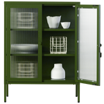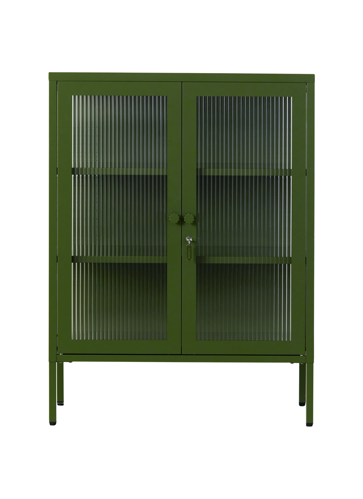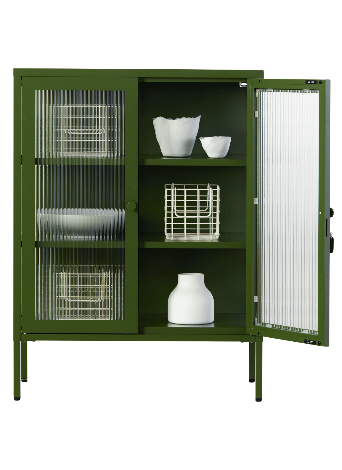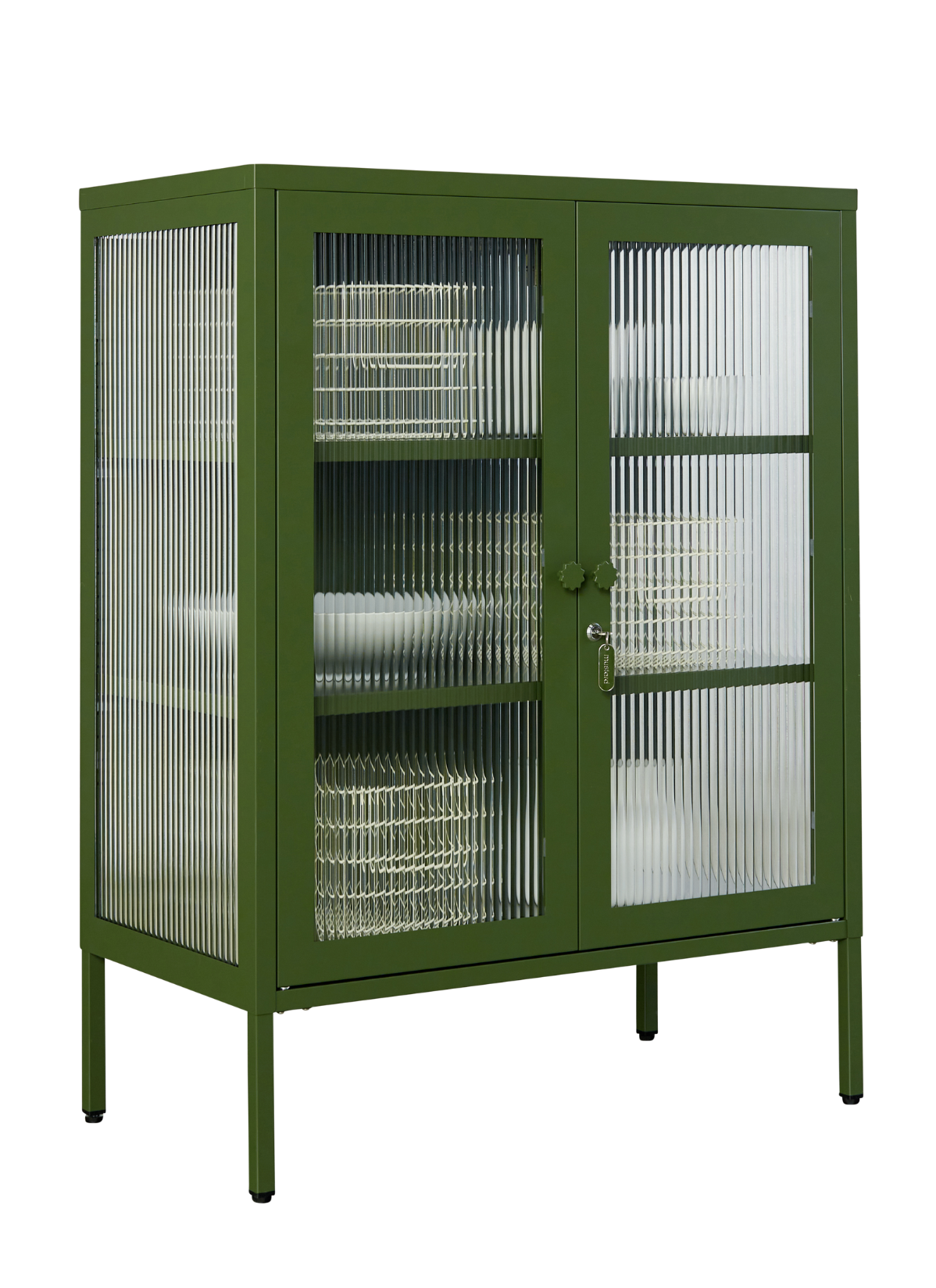 Inside you'll find two adjustable shelves, a door bolt and a subtle embossed 'mustard', to let you know it's the real deal. Outside, fluted glass panels are set in a metal frame with medallion handles, a lock, a custom Mustard enamel keyring, adjustable feet and wall attachment points. Screens don't always do our colours justice — order a swatch to see how it looks in your space.