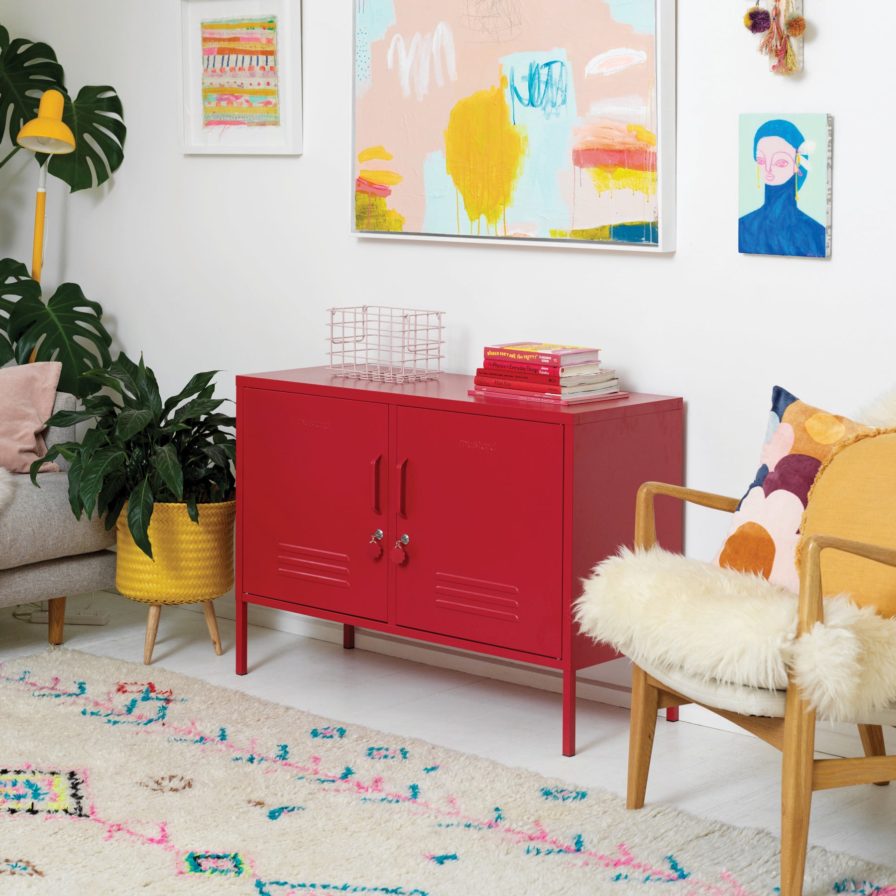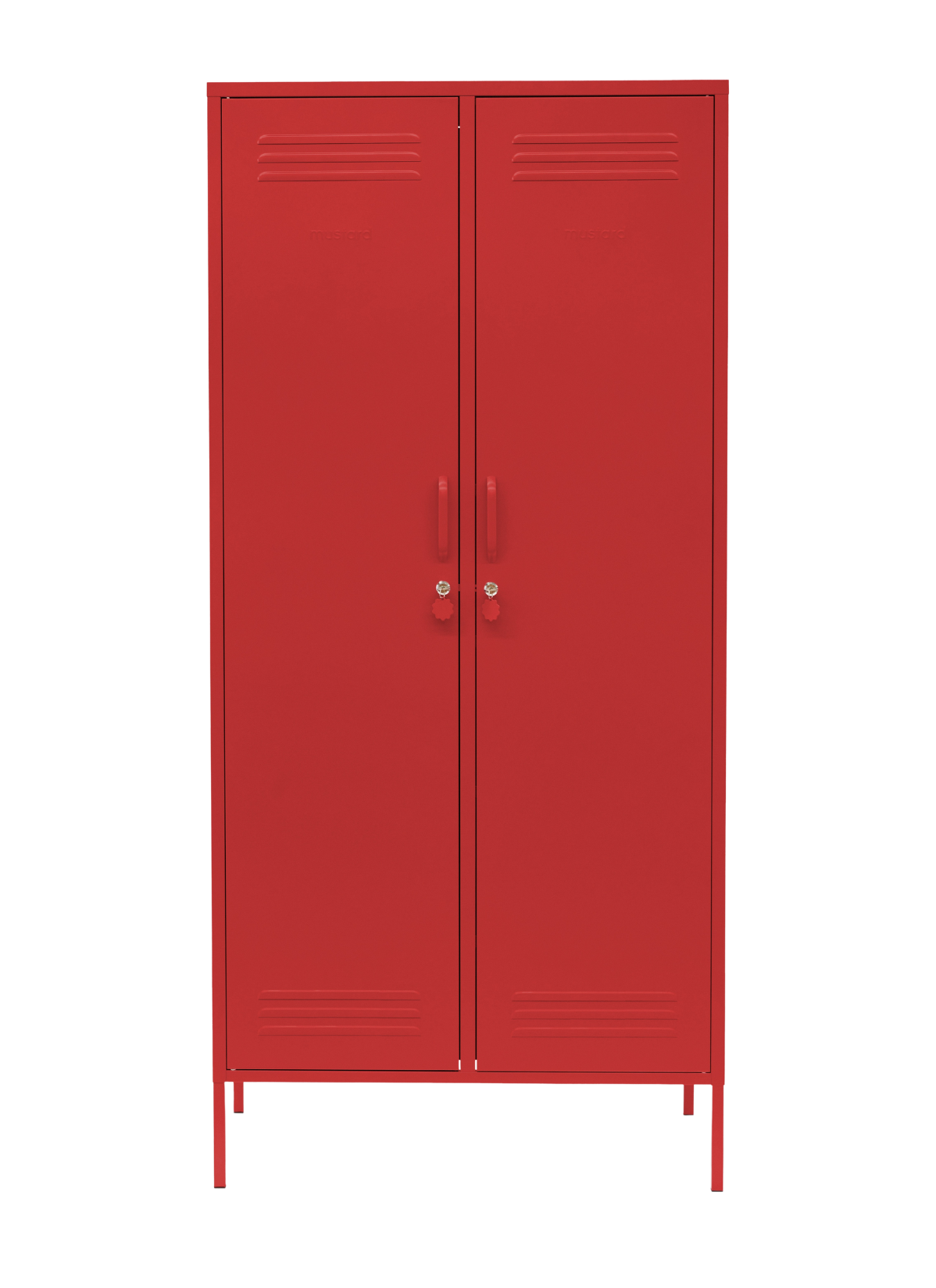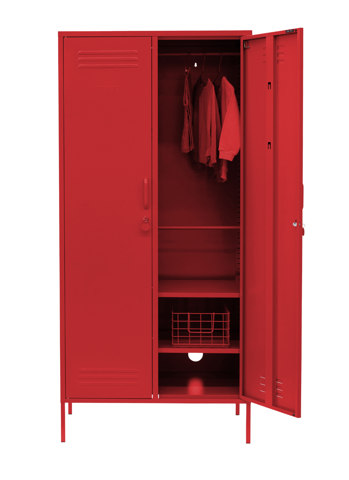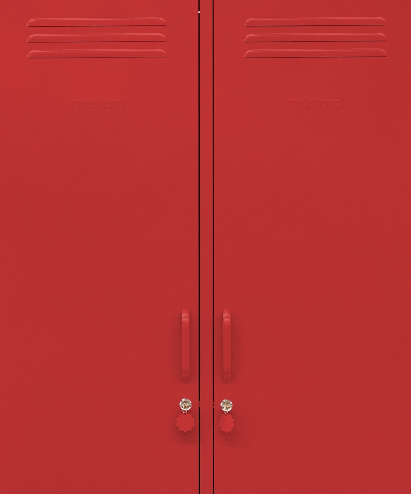 Inside, you'll find four adjustable shelves, two removable hanging rails and two handy hooks inside each door. On the outside, you'll find handles, locks, custom key rings, air vents, two cable holes, wall attachment points and a subtle embossed 'mustard' on each door, to let you know it's the real deal. Plus, the whole locker is smooth, matte and magnetic! Screens don't always do our colours justice — order a swatch to see how it looks in your space.
