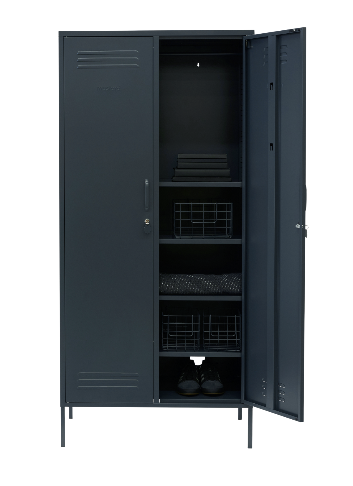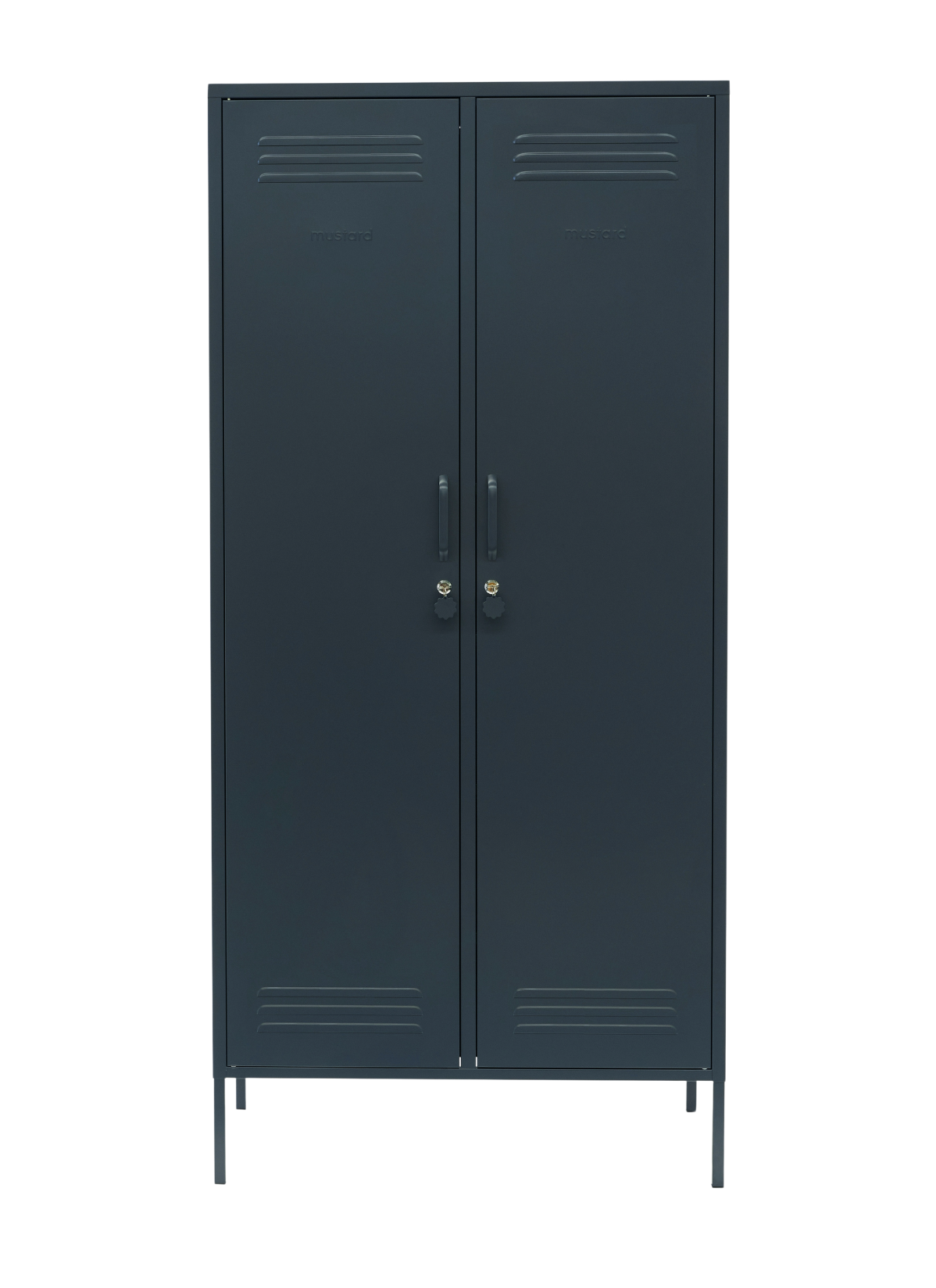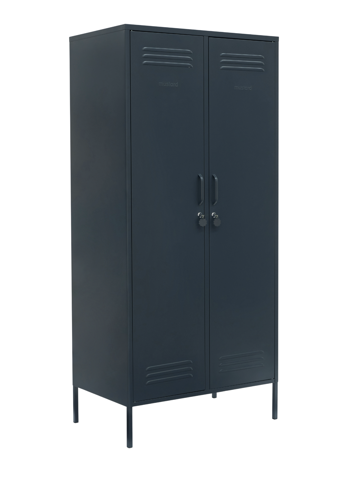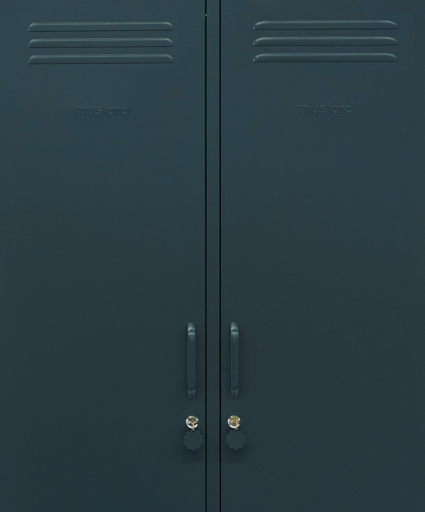 Inside, you'll find four adjustable shelves, two removable hanging rails and two handy hooks inside each door. On the outside, you'll find handles, locks, custom key rings, air vents, two cable holes, wall attachment points and a subtle embossed 'mustard' on each door, to let you know it's the real deal. Plus, the whole locker is smooth, matte and magnetic! Screens don't always do our colours justice — order a swatch to see how it looks in your space.